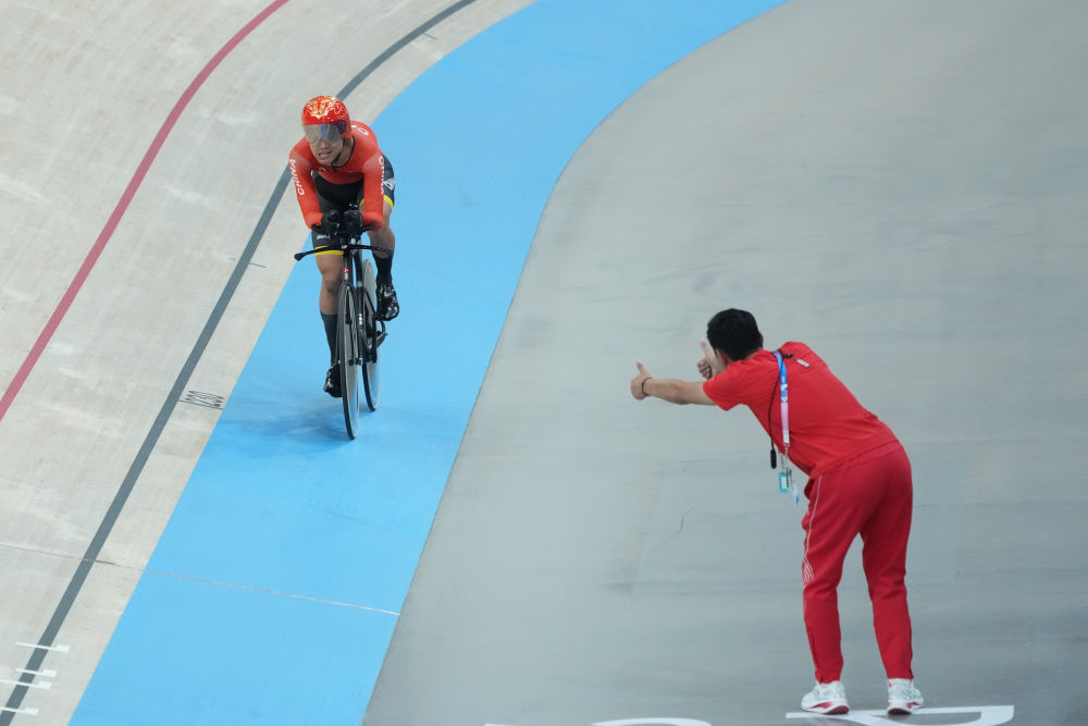 ↑8月29日,李樟煜(左)奪得場地自行車男子C1級3000米個人追逐賽冠軍后,他的教練宋年春豎起大拇指祝賀。新華社記者 賀燦鈴攝