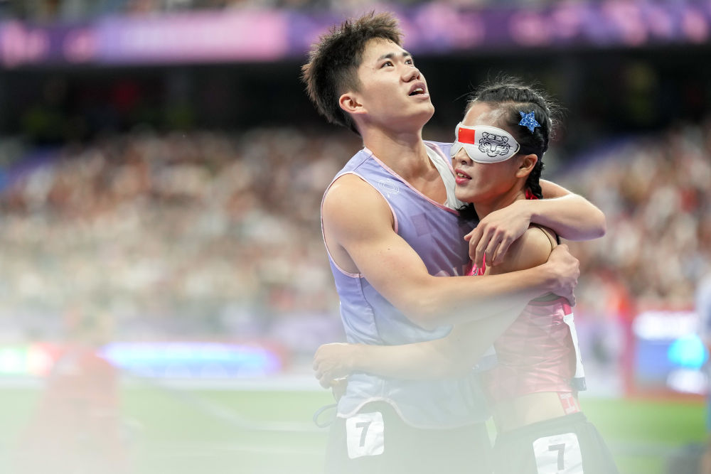 ↑9月3日,中國選手劉翠青(右)和領跑員陳圣明在田徑女子100米T11級決賽后擁抱。新華社記者 張鋮 攝