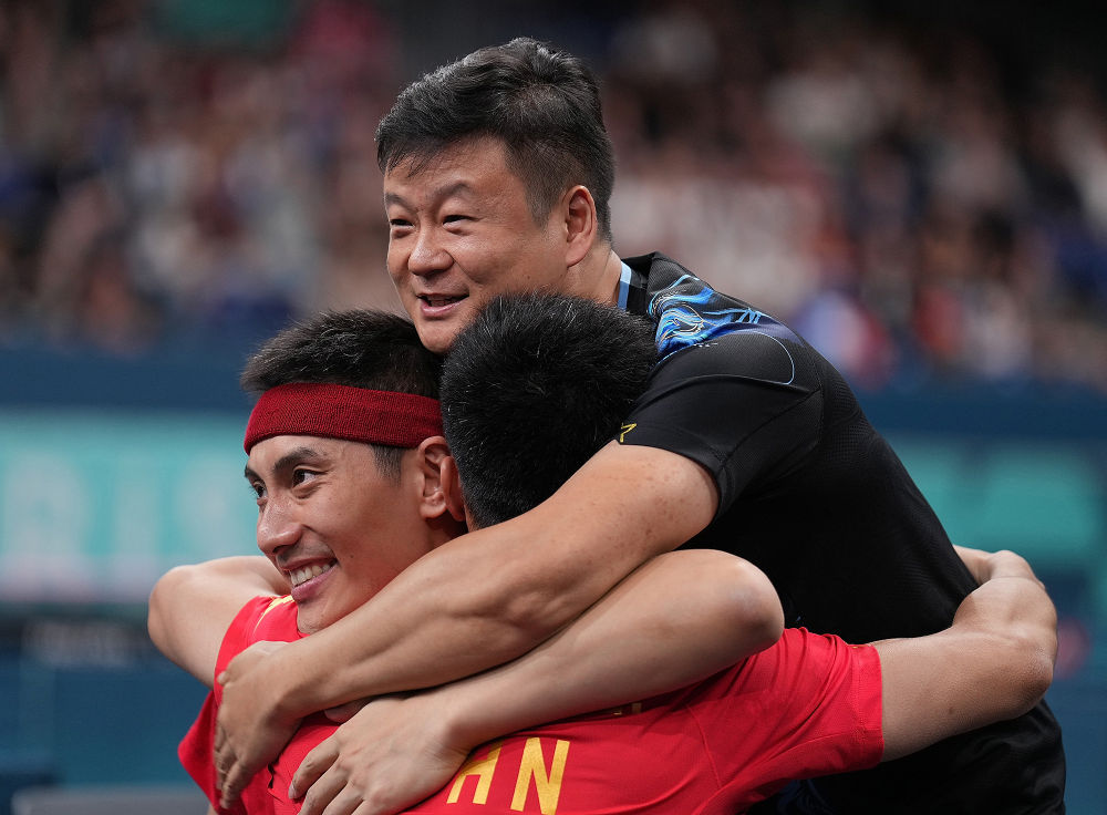 ↑8月31日,曹寧寧/馮攀峰(下左)奪得乒乓球男雙8級冠軍后與教練呂曉磊(上)擁抱慶祝奪冠。新華社記者 侯昭康 攝
