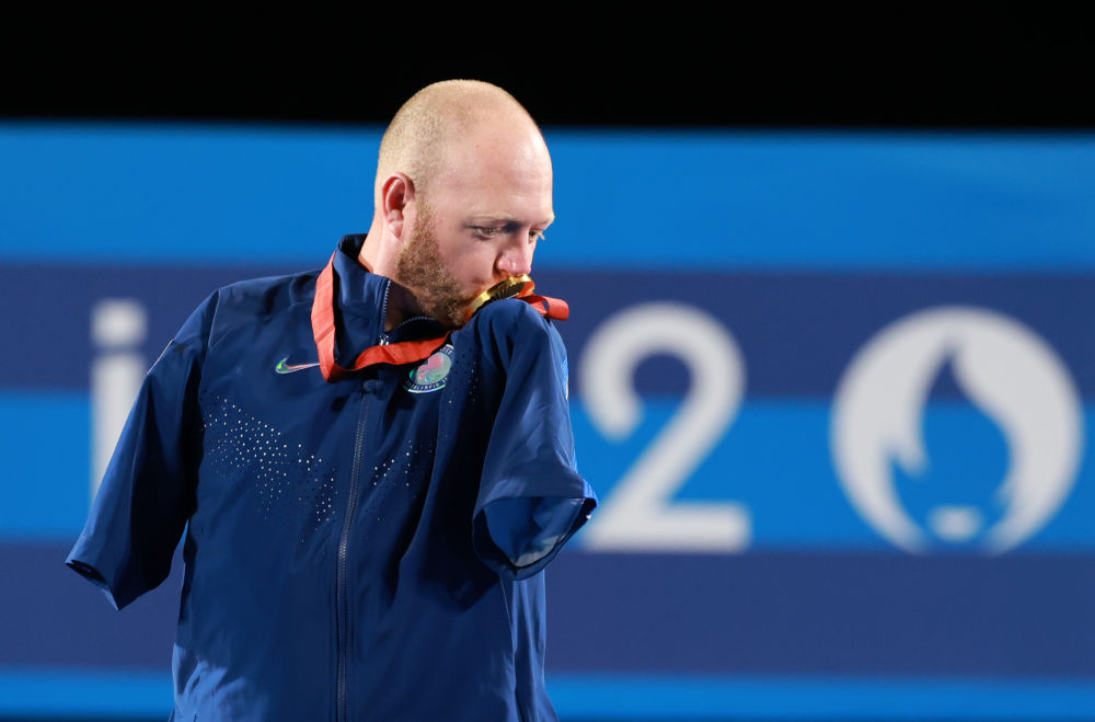 ↑9月1日,來自美國的無臂弓箭手、41歲的馬特·斯塔茨曼第四次在殘奧會賽場上向冠軍發起沖擊,最終他獲得射箭男子個人復合弓公開級金牌。這是斯塔茨曼在頒獎儀式上親吻金牌。 新華社記者 侯俊 攝