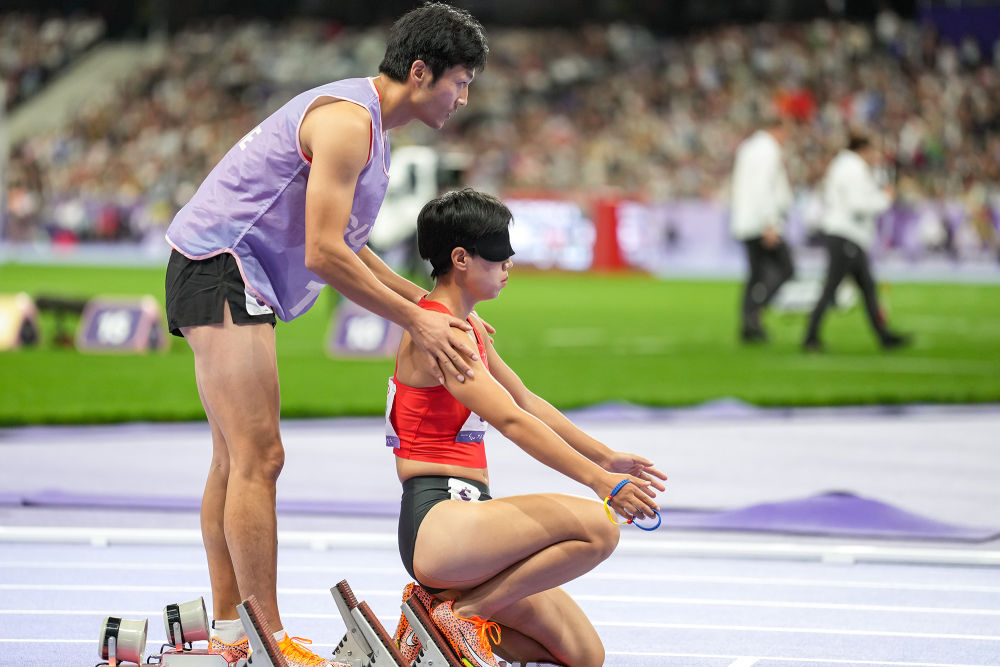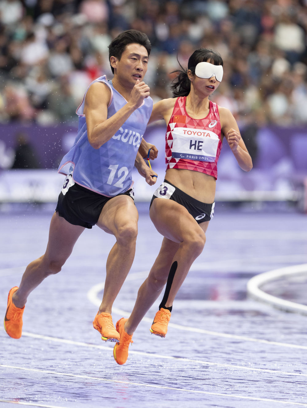 ↑8月30日,中國選手何珊珊(右)與領跑員游俊杰在田徑女子400米T11級預賽中。新華社記者 才揚 攝