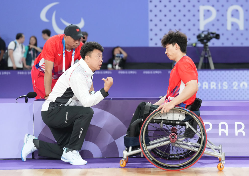 ↑9月2日,教練董炯(前左)在羽毛球男子單打WH1級決賽中指導球員屈子墨。新華社記者 賀燦鈴 攝