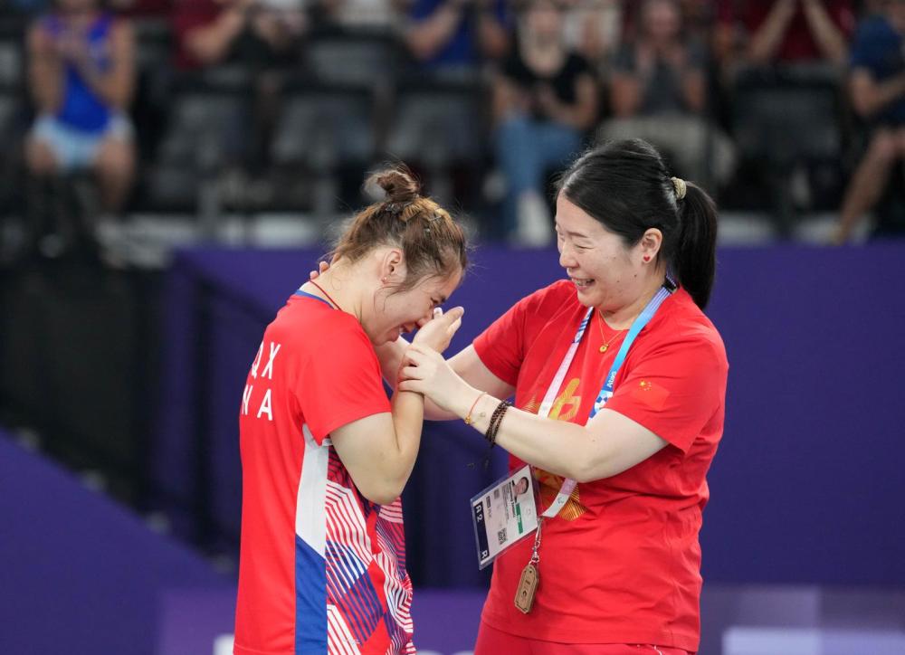 ↑9月2日,羽毛球女子單打SU5級決賽后,教練張先明(右)安慰獲勝后喜極而泣的中國選手楊秋霞。新華社記者 賀燦鈴 攝