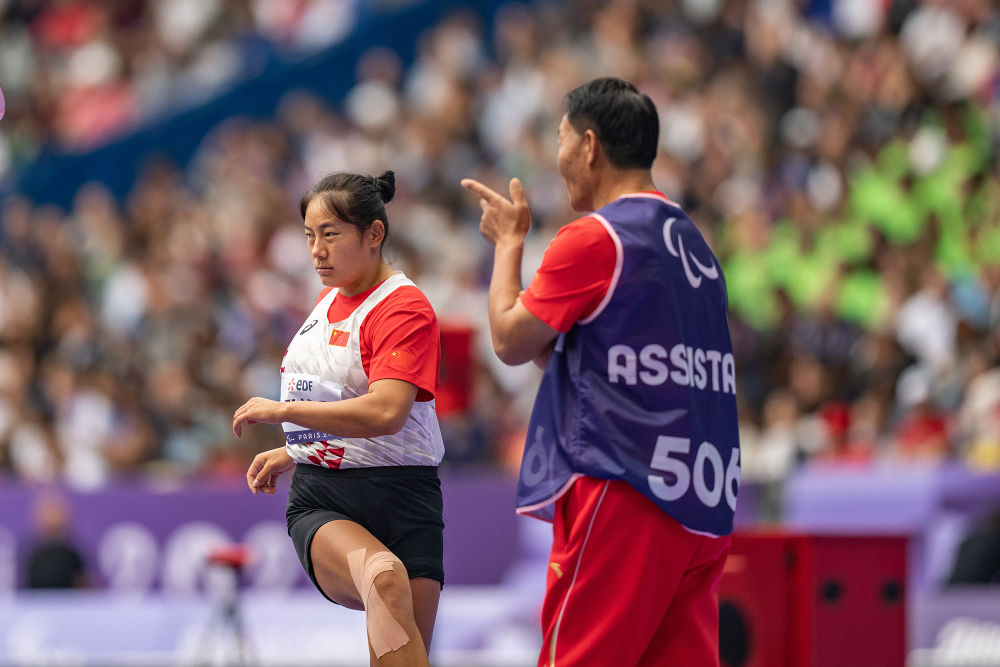 ↑8月31日,參加田徑女子標槍F13級決賽的中國選手趙玉萍(左)在教練李秀清的指導下熱身。最終,趙玉萍以47米06的成績奪得冠軍,并創造了新的女子標槍F12級世界紀錄。新華社記者 黃偉 攝
