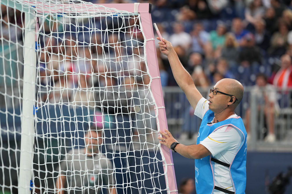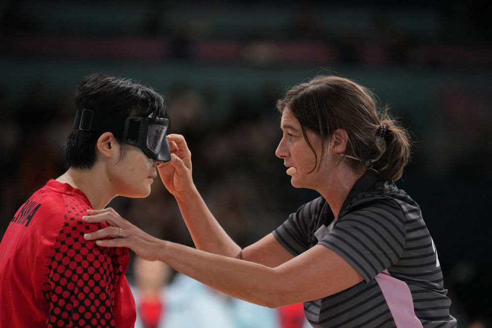 ↑9月5日,裁判在盲人門球女子銅牌賽前查看中國隊球員曹振華的眼罩。新華社記者 侯昭康 攝