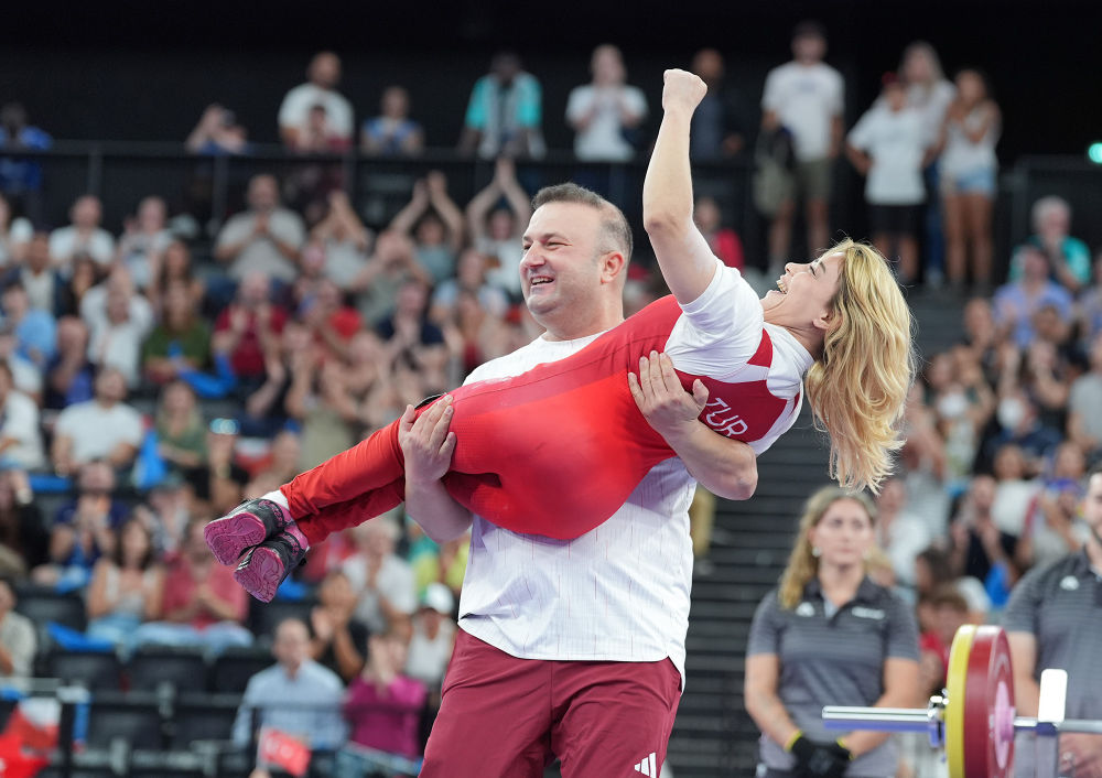 ↑9月4日,參加舉重項目女子45公斤以上級比賽的土耳其選手納茲米耶試舉成功后,教練將她抱起慶祝。新華社記者 連漪 攝