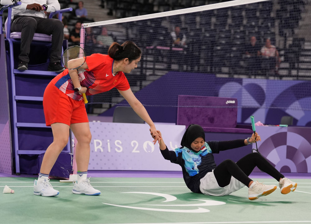 ↑9月2日,中國選手肖祖賢(左)在羽毛球女子單打SL3級決賽中扶起摔倒的對手、印度尼西亞選手沙庫爾奧。新華社記者 邢廣利 攝