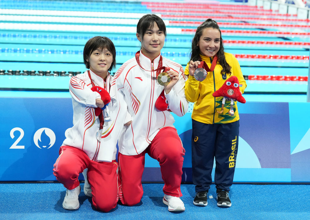 ↑9月3日,游泳女子50米蝶泳S6級冠軍中國選手蔣裕燕(中)、亞軍中國選手劉道敏(左)蹲下與季軍巴西選手佩措爾德合影。 新華社記者 高靜 攝
