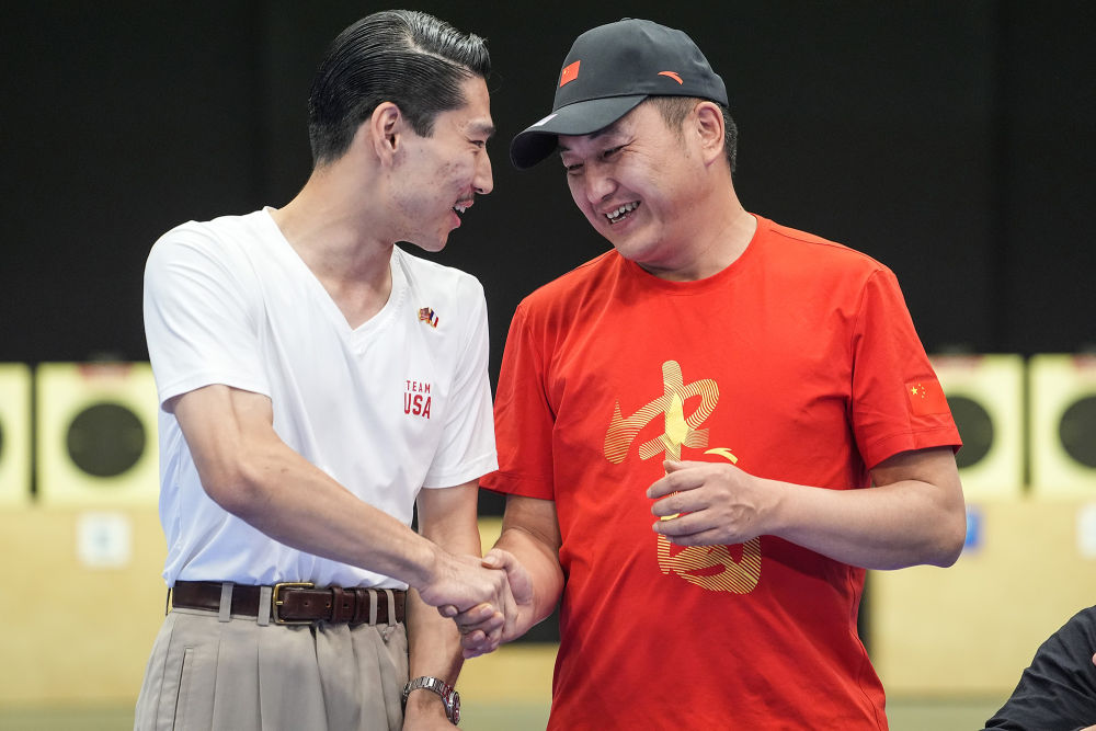 ↑9月2日,射擊混合25米手槍P3-SH1級冠軍、中國選手楊超(右)與亞軍美國選手龔彥曉握手致意。新華社記者 彭子洋 攝