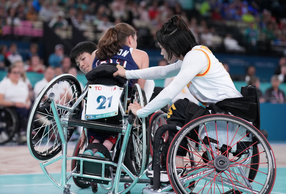 ↑9月6日,中國隊球員陳雪靜(右)、呂桂娣在輪椅籃球女子半決賽中扶起倒地的美國隊球員伊頓(中)。新華社記者 高靜 攝