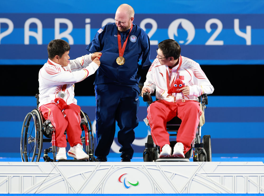 ↑9月1日,射箭男子個人復合弓公開級亞軍、中國選手艾新亮(左)在領獎臺上幫助冠軍美國選手馬特·斯塔茨曼(中)把獲頒的殘奧會吉祥物“弗里熱”裝進口袋。新華社記者 侯俊 攝