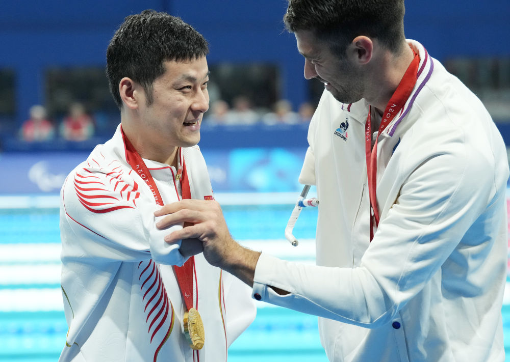 ↑9月3日,游泳男子50米蝶泳S6級季軍、法國選手沙達爾(右)與冠軍王金剛在頒獎儀式上相互致意。新華社記者 高靜 攝