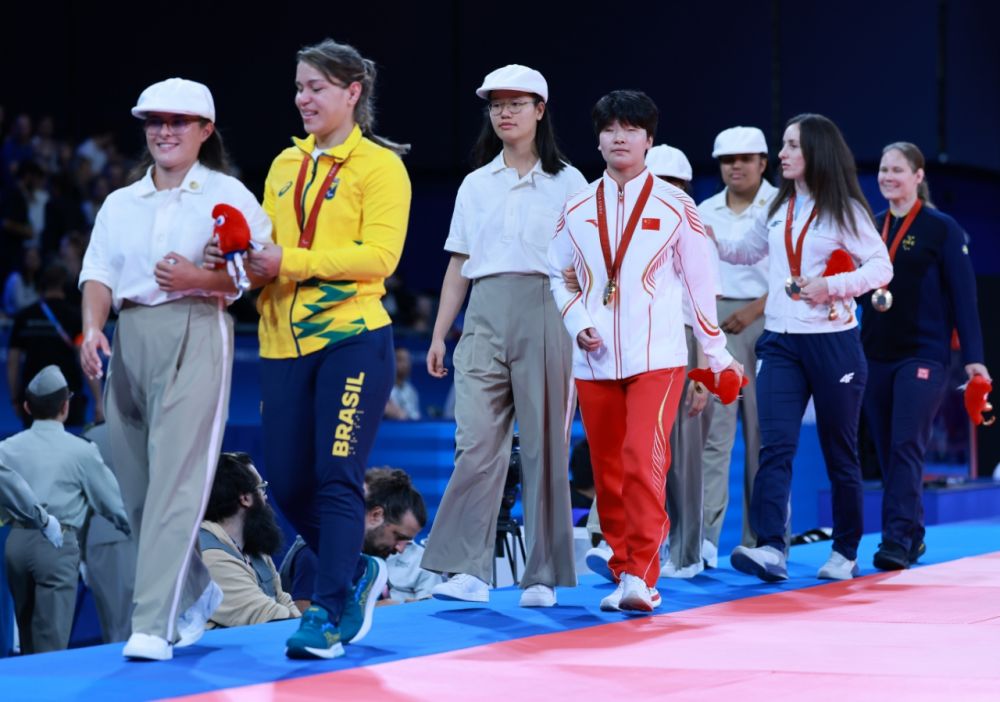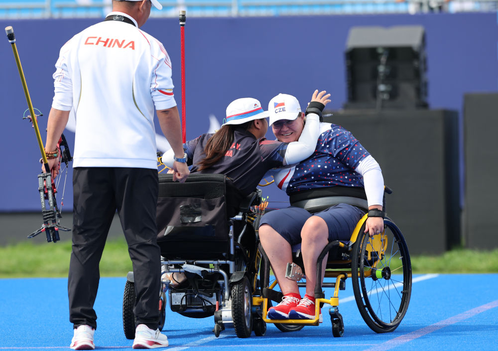 ↑8月31日,射箭女子個人W1級金牌獲得者、中國選手陳敏儀(中)賽后與對手、捷克選手普爾塔爾·穆西洛娃(右)擁抱。新華社記者 侯俊 攝