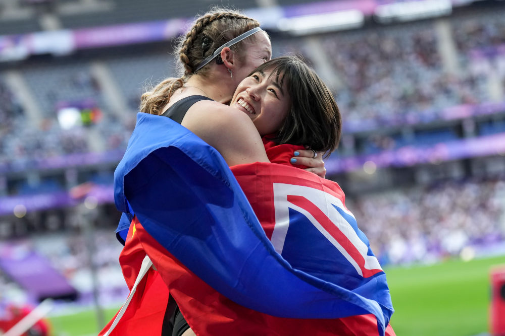 ↑9月4日,田徑女子100米T36級冠軍、中國選手史逸婷(右)與亞軍新西蘭選手艾奇遜在比賽后擁抱慶祝。新華社記者 張鋮 攝