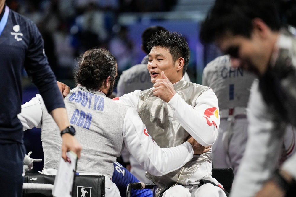 ↑9月5日,中國隊選手馮彥可(右二)在頒獎儀式后和英國隊選手迪米特里互相祝賀。在輪椅擊劍項目男子花劍團體賽決賽中,中國隊戰勝英國隊,獲得冠軍。新華社記者 張豪夫 攝
