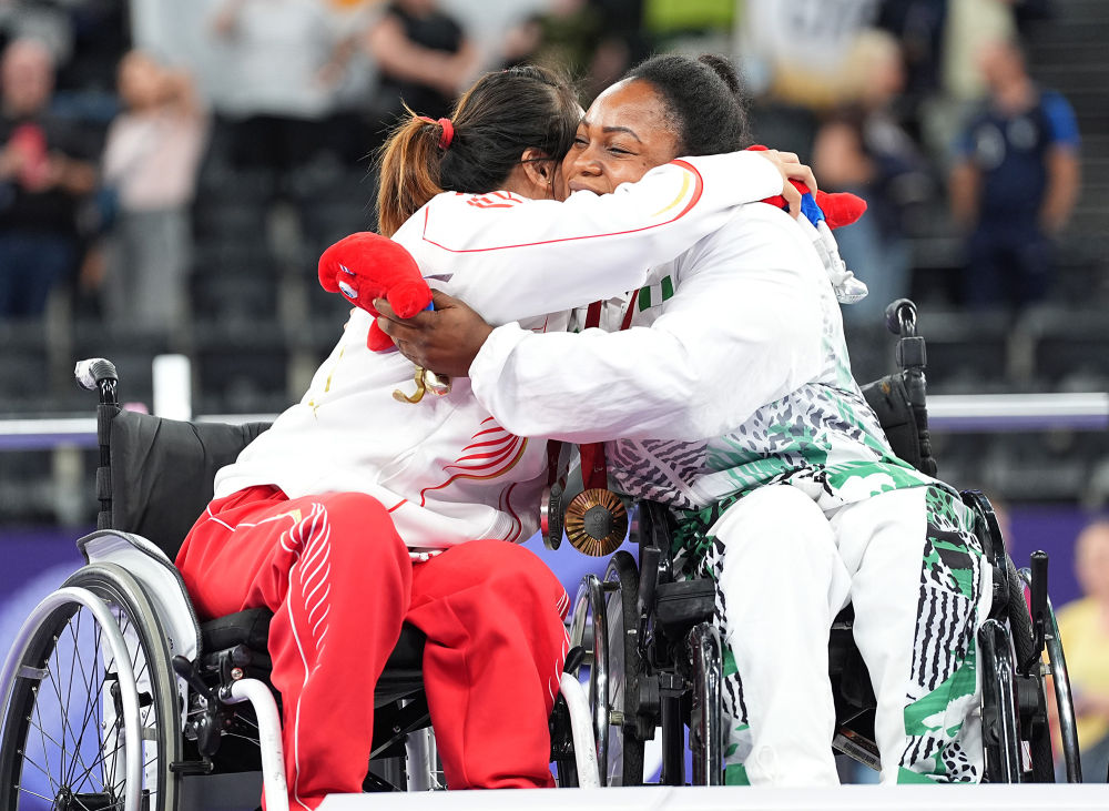 ↑9月6日,舉重女子61公斤級冠軍尼日利亞選手馬克(右)在頒獎儀式上擁抱亞軍中國選手崔建金。新華社記者 連漪 攝
