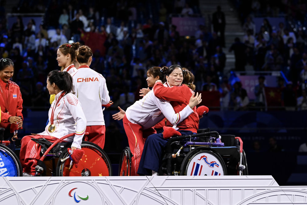↑9月7日,輪椅擊劍女子重劍團體賽冠軍中國隊的鄒緒鳳(右二)在頒獎儀式后和季軍泰國隊的乍那(右一)擁抱。 新華社記者 張豪夫 攝