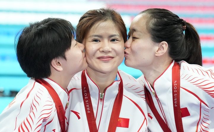 ↑9月3日,何圣羔(中)、劉玉賽后親吻盧冬。當日,在巴黎殘奧會游泳女子50米仰泳S5級決賽中,中國選手盧冬、何圣羔、劉玉包攬冠亞季軍。新華社記者 高靜攝