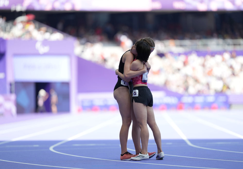 ↑9月1日,田徑女子200米T36級冠軍中國選手史逸婷(右)在比賽后與獲得亞軍的新西蘭選手艾奇遜擁抱。新華社記者 賀燦鈴 攝