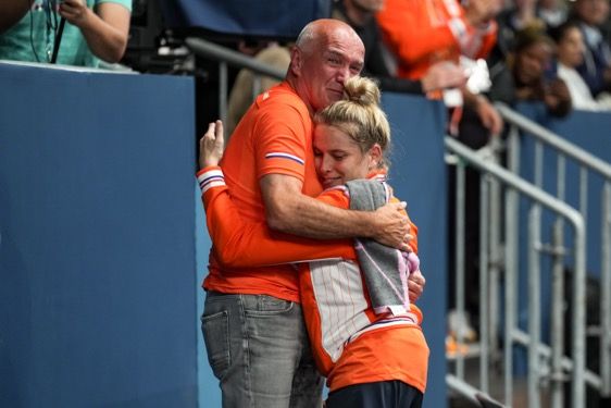 ↑9月5日,荷蘭選手凱莉·范宗(右)在乓乓球女單7級決賽后與家人擁抱。新華社記者張鋮攝