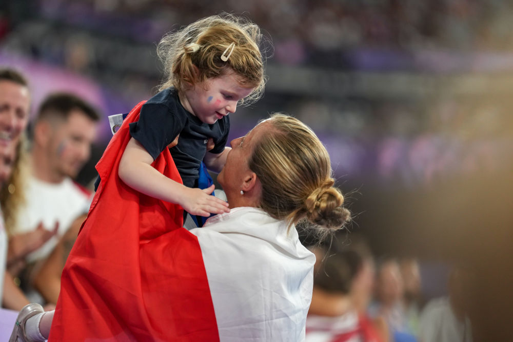 ↑9月1日,法國選手熱內在女子跳遠T37級決賽后與女兒擁抱。新華社記者 張鋮 攝