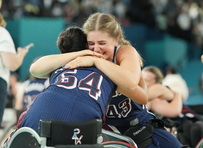 ↑9月6日,在輪椅籃球女子半決賽后,美國球員莫迪(右)與隊友岡薩雷斯擁抱。新華社記者 賀燦鈴 攝