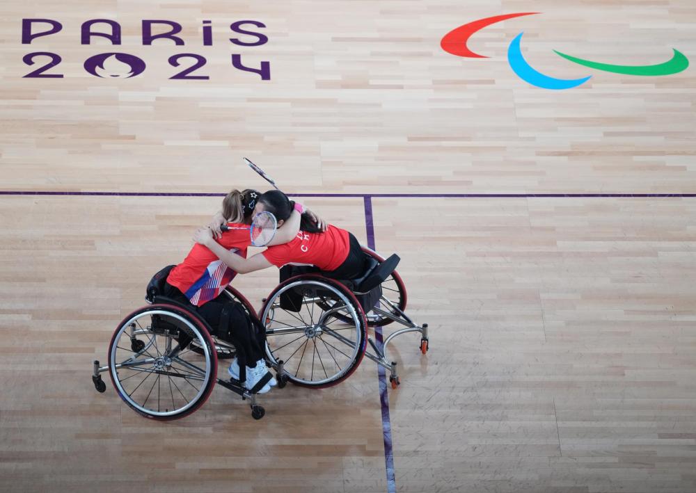 ↑9月1日,在羽毛球女子雙打WH1-WH2級決賽后,中國組合劉禹彤(右)/尹夢璐相擁慶祝勝利。新華社記者 賀燦鈴 攝