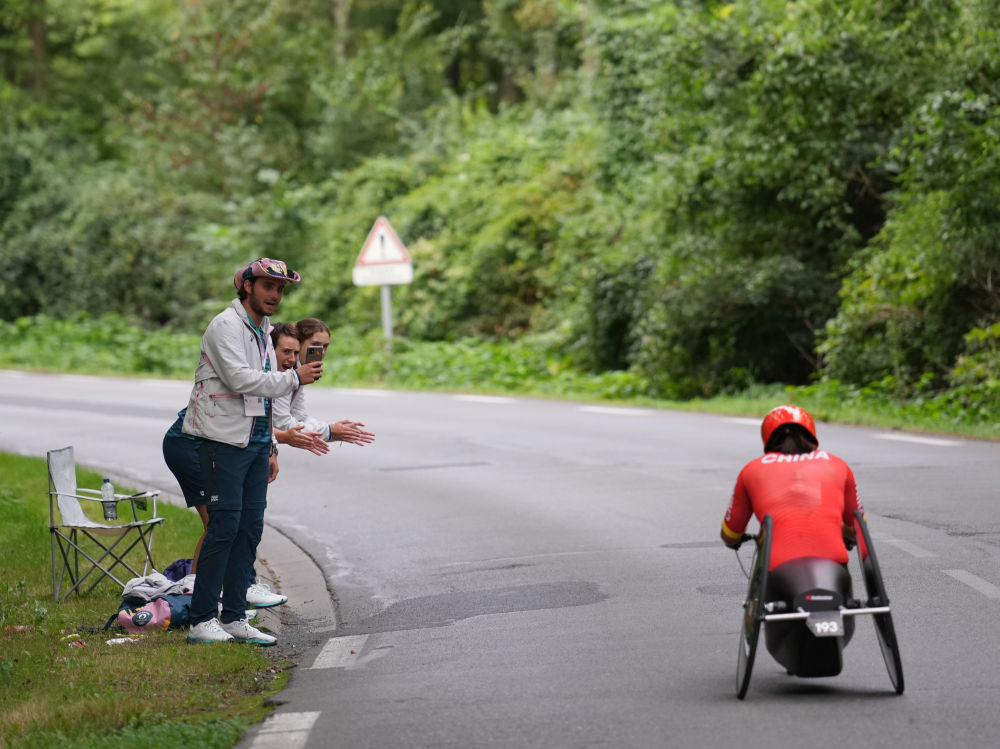↑9月4日,在公路自行車女子個人計時賽H4-5級比賽中,志愿者們為中國選手孫變變加油。新華社記者 賀燦鈴 攝