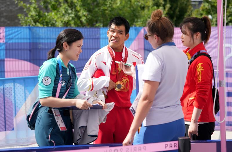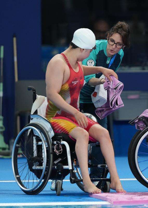 ↑9月5日,在巴黎殘奧會游泳女子100米蛙泳SB7級決賽后,志愿者(右)為中國選手陳淑玲遞毛巾。