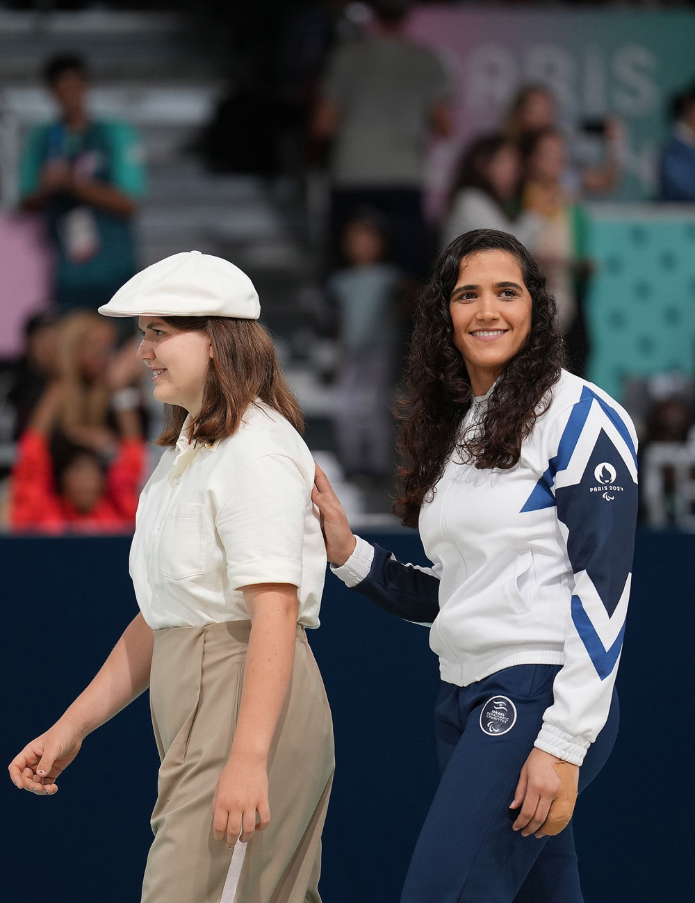 ↑9月5日,巴黎殘奧會志愿者引導以色列隊球員參加盲人門球女子組頒獎儀式。新華社記者 侯昭康 攝