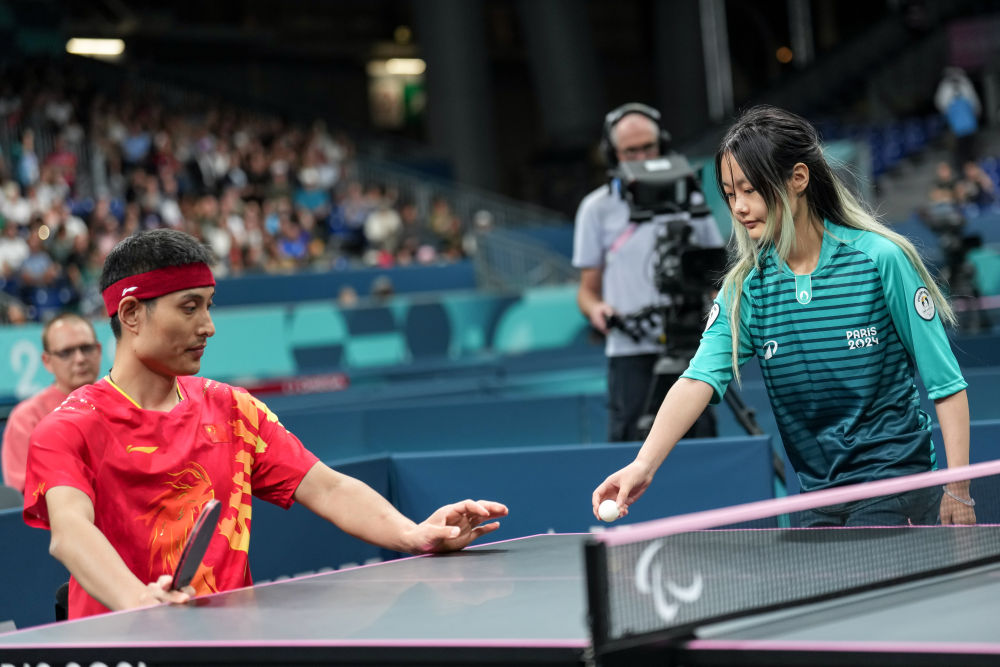 ↑9月5日,在乓乓球男單3級決賽中,一名志愿者(右)幫助輪椅選手撿拾乒乓球。新華社記者張鋮攝