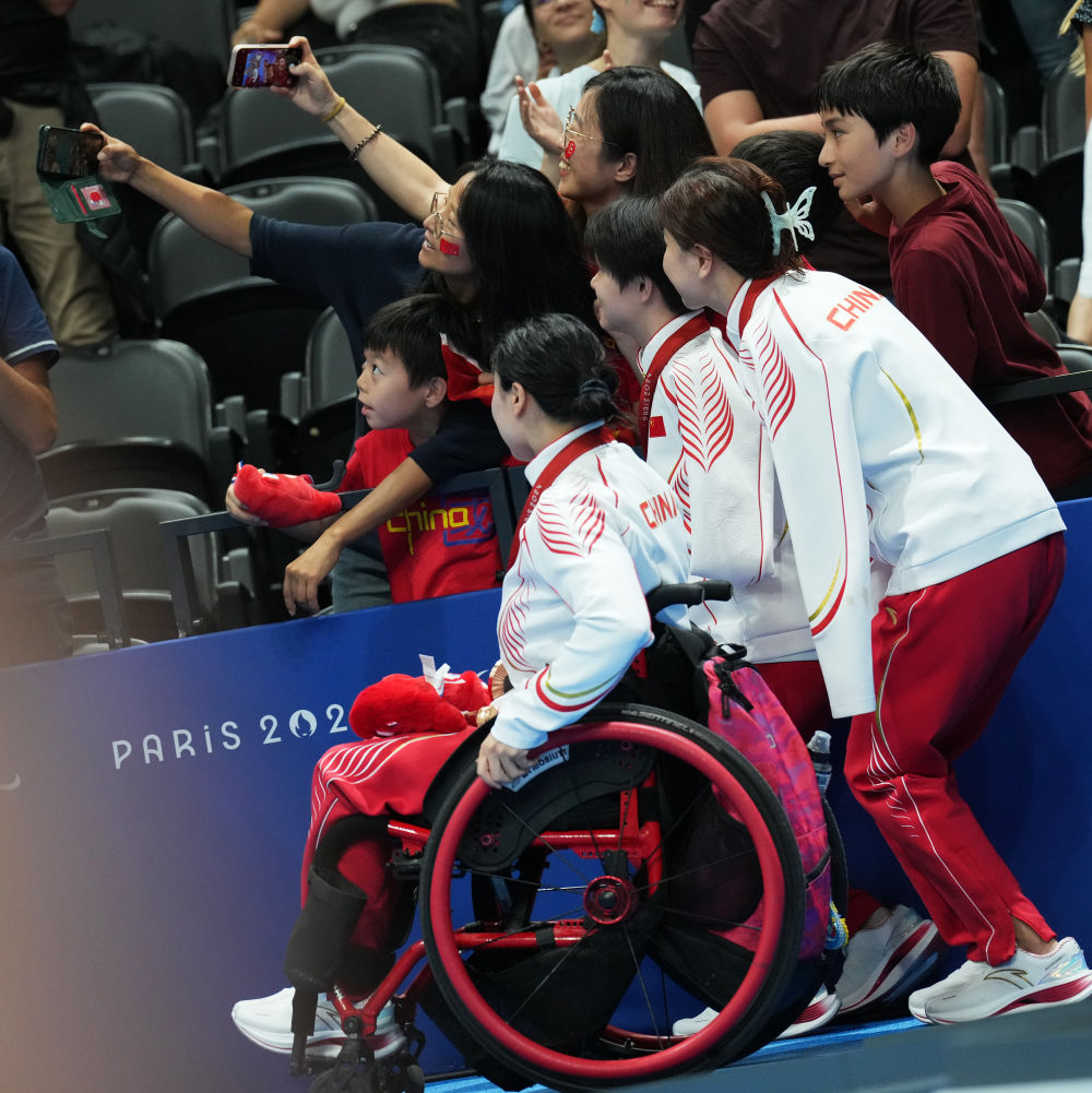 9月7日,觀眾與包攬女子200米個人混合泳SM5級冠亞季軍的中國選手何聖羔(前中)、盧冬(前右)和成姣(前左)自拍合影。新華社記者 高靜 攝