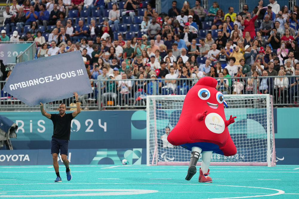 ↑9月3日,盲人足球A組小組賽中場休息時,工作人員和巴黎殘奧會吉祥物與觀眾進行互動。新華社記者 熊琦 攝