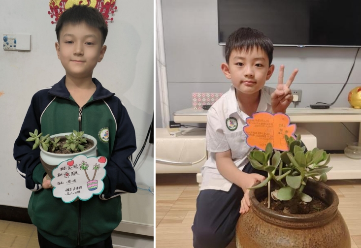 一年級學生每人準備多肉植物或易養護的綠植作為專屬綠寵。學生為綠寵制作個性化標簽,寫下自己的名字和對綠寵的介紹。