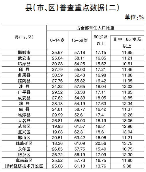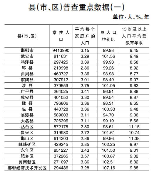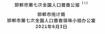 根據《全國人口普查條例》和國務院的決定,我國以2020年11月1日零時為標準時點進行了第七次全國人口普查[2]。按照國務院、省人口普查領導小組的統一安排部署,在市委、市政府的領導下,各級普查機構和各相關部門精心組織,廣大普查對象積極配合,通過全體普查人員的艱苦努力,邯鄲市順利完成人口普查現場登記工作。根據國務院人普辦反饋的初步數據,現將2020年11月1日零時邯鄲市人口的基本情況公布如下: