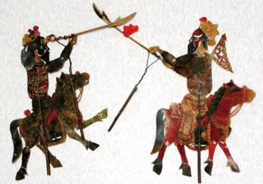 影人高度約在50公分左右,造型分為生(老生、小生)、旦、凈(即花臉)、丑等行當(dāng)。生、旦、凈角高大,小丑、小妖等角色要小一些。文人造型大多只有一只胳膊,武將則有兩只胳膊。騎馬的影人,上半身是活動的,下半身則是與馬刻繪在一起的一個整體。除刻人物外,還要刻制云朵、桌椅、動物、水族、城樓、房屋等。除凈角、丑角用陰刻與陽刻相結(jié)合的手法刻臉譜外,生角、旦角用鏤空雕刻,顯得空靈、爽潔。人物的頭像是一個單獨件,能隨意拔出與身子分離,眾多的角色頭像可根據(jù)劇情的發(fā)展、文武服裝的變化等隨時更換不同的身子,而行當(dāng)相同、服裝類似的人物也可任意更換頭像。在影人的造型、色彩和雕刻的處理上,除在人物需要的特點基礎(chǔ)上進行概括夸張外,又受到民間剪紙和戲劇臉譜的影響,逐漸形成了既有程式化、又各具角色特征的造型體制。