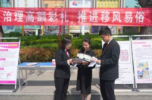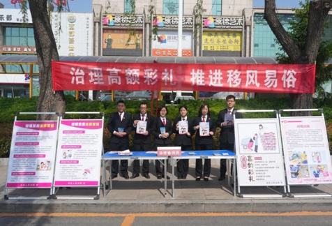 今年2月1日,《最高人民法院關于審理涉彩禮糾紛案件適用法律若干問題的規定》正式施行,新規明確了彩禮范圍……”干警們用通俗易懂的語言向過往群眾解讀了《規定》中關于彩禮的認定范圍、彩禮與戀愛期間贈與的區別、借婚姻索取財務等彩禮糾紛的處理。同時通過典型案例宣講,呼吁大家摒棄盲從跟風心里,自覺抵制高額彩禮,讓婚姻始于愛,讓彩禮歸于禮。
