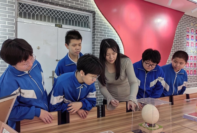 圖為該校美術老師劉子語為同學們講述文創手工作品創作過程。