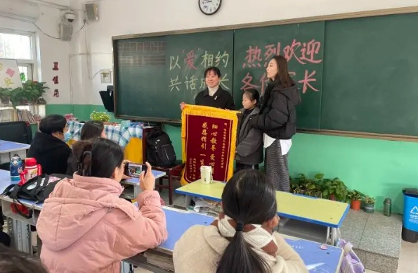 11月26日該校三年級家長會上,三(1)班趙梓彤家長帶著真誠與謝意,向班主任黃瑞芝老師贈送錦旗。