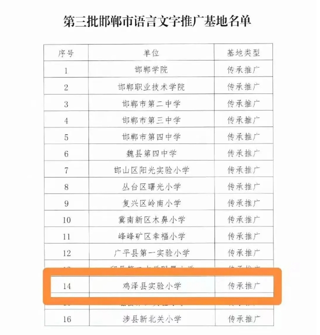 近日,邯鄲市教育局印發(fā)了《關于公布第三批邯鄲市語言文字推廣基地名單的通知》,雞澤縣實驗小學被評為第三批邯鄲市語言文字推廣基地。此次評選是由邯鄲市教育局和邯鄲市語言文字工作委員會共同舉辦,雞澤縣實驗小學通過單位申報、專家評審、實地考察、綜合評議等程序成功獲評。李鐵 李現(xiàn)海 齊迷芹