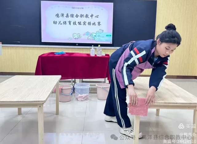在幼兒成長(zhǎng)的過程中,健康安全的環(huán)境至關(guān)重要,而桌面消毒作為日常保育工作的關(guān)鍵環(huán)節(jié),直接關(guān)系到幼兒的身體健康。為了提升中職幼兒保育專業(yè)學(xué)生的實(shí)踐操作能力,強(qiáng)化她們的衛(wèi)生安全意識(shí),雞澤縣綜合職教中心舉辦了一場(chǎng)別開生面的幼兒保育專業(yè)桌面消毒技能實(shí)操比賽。賽場(chǎng)上,同學(xué)們化身“安全小衛(wèi)士”,用專業(yè)與細(xì)致詮釋對(duì)幼兒健康的守護(hù)。