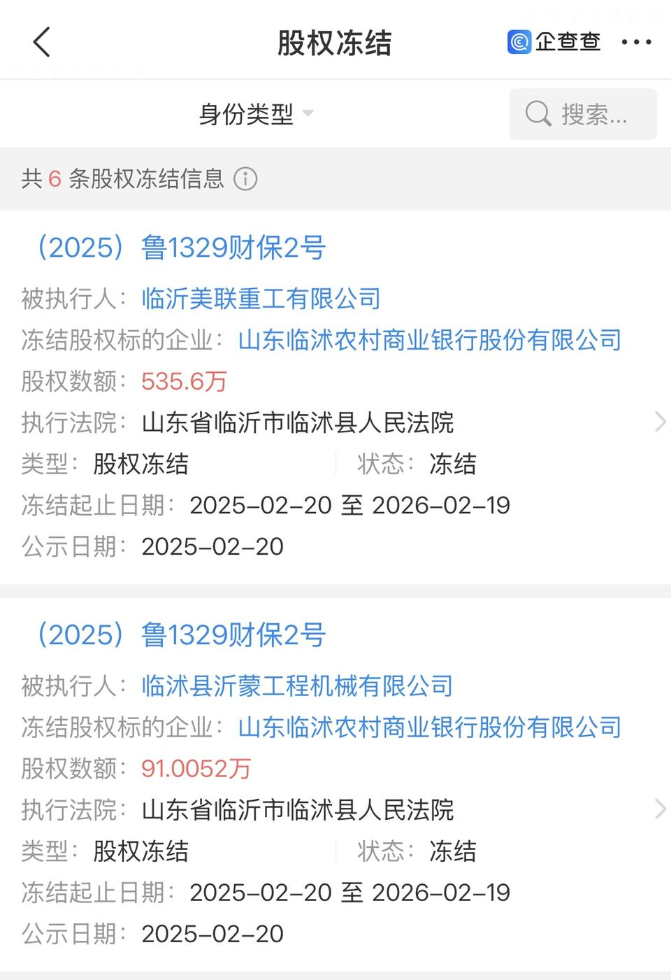 新近被凍結股權的持有人分別為臨沂美聯重工有限公司與臨沭縣沂蒙工程機械有限公司(簡稱“沂蒙機械”),二者對臨沭農商行持股比例為0.88%、0.15%,對應凍結股權數額為535.6萬、91.01萬,二者涉同一財產保全案件。