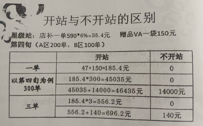 為了吸引顧客“開(kāi)站”,工作人員又算了另一筆賬:按照單純賣(mài)貨的模式,750元就能占據(jù)一個(gè)點(diǎn)位,賣(mài)出三單(2:1或1:2)可拿到140元。如果開(kāi)設(shè)“星站”,賣(mài)出一單(750元),從與公司給的拿貨價(jià)之間可以獲得160元。此外,每賣(mài)出一單,公司還會(huì)額外給價(jià)值150元的貨,“貨賣(mài)了不也是錢(qián)嗎。”還能拿到35.4元的“店補(bǔ)”,總計(jì)能獲得345.4元。如果是在有大區(qū)的情況下,“還可以碰,哪怕碰一個(gè)1:2或2:1,還能再碰(獲得)140元,最終能賺485.4元。”