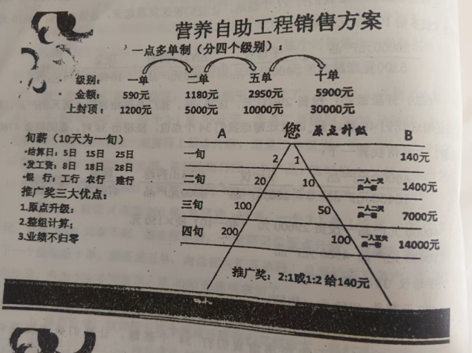 根據(jù)江彤的講述及其推薦的銷(xiāo)售體系講解視頻,記者了解到,消費(fèi)者加入銷(xiāo)售的方式共有兩種,即成為“站點(diǎn)”或者“站長(zhǎng)”。每個(gè)“站點(diǎn)”可將自己的“下線”劃分為AB兩個(gè)區(qū),在個(gè)人所處的點(diǎn)位往下,按照AB區(qū)開(kāi)單數(shù)量進(jìn)行比對(duì),有多少個(gè)2:1或者1:2,“公司就給多少個(gè)140元。”換句話說(shuō),每賣(mài)出三單,能獲得140元獎(jiǎng)勵(lì)。如果介紹的人夠多,還可以形成大區(qū),獲利更多,“這才是大錢(qián)。比如我這一天賣(mài)出去10單1:2或者2:1,這一天我就收獲1400元。”視頻中,一位工作人員進(jìn)一步舉例,“假設(shè)在你的點(diǎn)位之下,你介紹甲吃(買(mǎi))了590元,又介紹乙吃了590元,也可以介紹丙也吃了590元,又或者丙是甲或乙介紹的,這都無(wú)所謂,只要在你點(diǎn)位往下,不管是張三干(賣(mài))的,還是李四王五干的,與你全有業(yè)績(jī)關(guān)系。(可以)將甲乙放在A區(qū),丙在B區(qū),兩個(gè)區(qū)2:1,就形成(賺)了140元。”