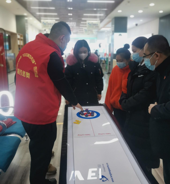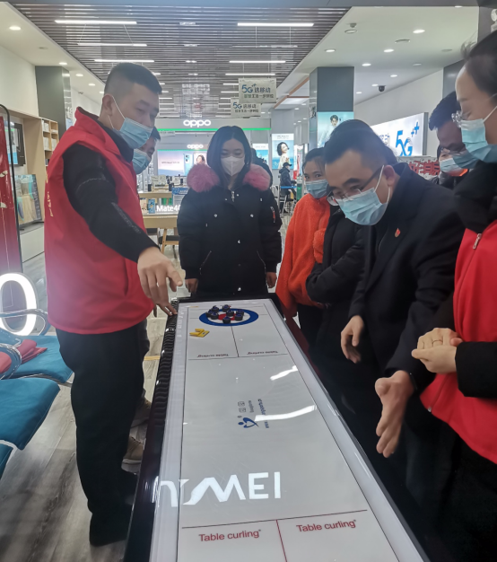 “冰壺呢,又叫擲冰壺,是一項冰上投擲性競賽項目,被譽為冰上的‘國際象棋’,考驗參與者的體力與腦力……”走進中國移動宣化分公司西馬道營業廳,桌上冰壺“比賽現場”映入眼簾,黨員志愿者正在聲情并茂的向客戶們介紹2022年冬奧會比賽項目——冰壺的起源、比賽形式、賽制規則等,這是宣化分公司黨支部開展的“相約冬奧——扛紅旗、當先鋒”系列活動之一——“助力冬奧,全民健身”推廣活動,邀請廣大客戶一起體驗精彩紛呈桌上冰壺比賽。
