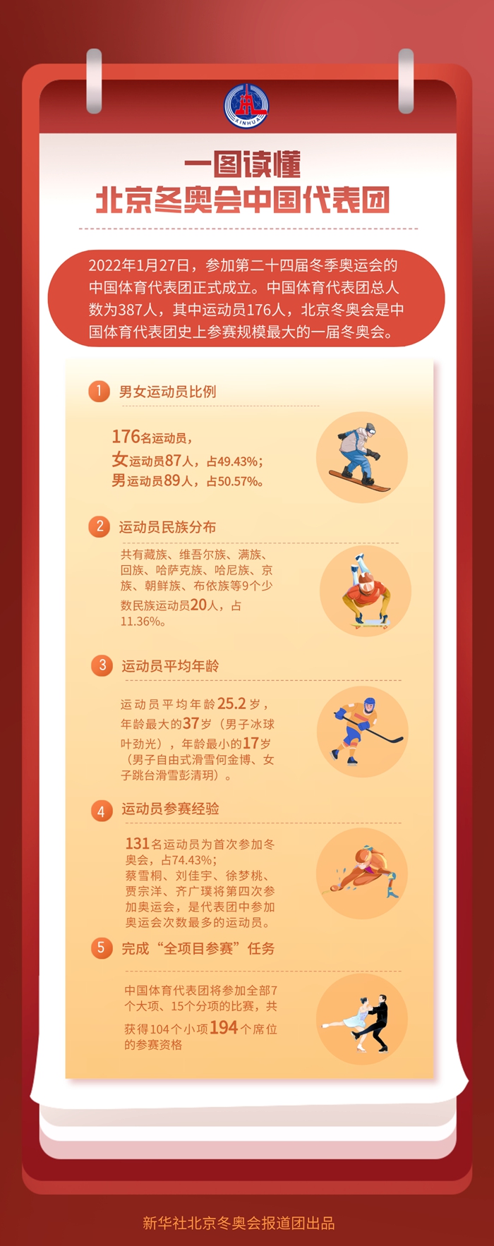 北京冬奧會中國體育代表團總人數為387人,其中運動員176人,教練員、領隊、科醫人員等運動隊工作人員164人,團部工作人員47人。北京冬奧會是中國體育代表團歷史上參賽規模最大的一屆冬奧會。
