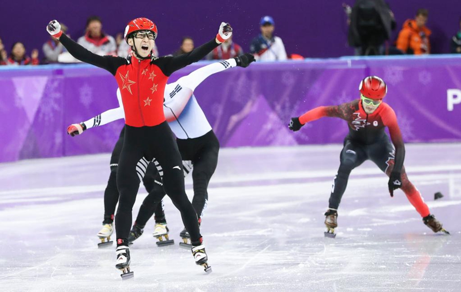 2018年2月22日,在平昌冬奧會短道速滑男子500米決賽中,中國選手武大靖奪冠后慶祝。新華社記者 韓巖 攝