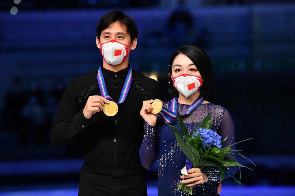 2021年11月7日,雙人滑冠軍、中國組合隋文靜(右)/韓聰在2021-2022賽季花樣滑冰大獎賽意大利站頒獎儀式后展示金牌。新華社記者 金馬夢妮 攝