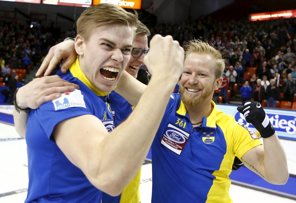 2015年4月5日,男子冰壺世錦賽決賽,瑞典隊球員松德格倫(左)與隊友埃?。ㄓ遥┖土值滤固貍悜c祝奪得冠軍。新華社/路透