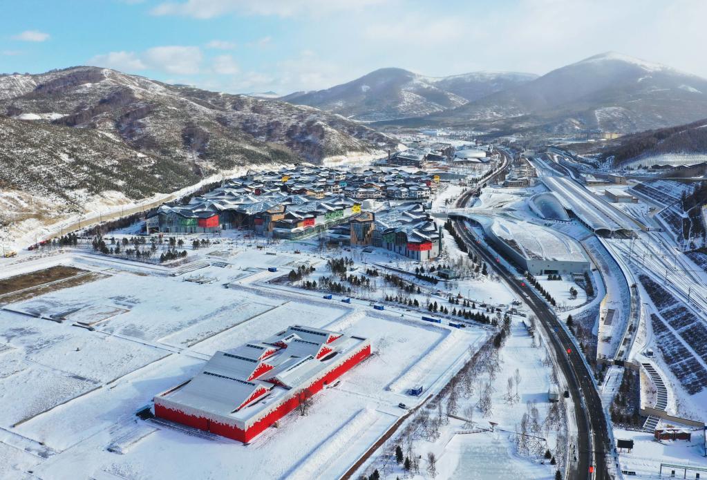 2021年11月8日拍攝的張家口市崇禮區太子城遺址陳列館(下)、太子城冰雪小鎮(上左)和高鐵太子城站(上右)。新華社記者楊世堯攝
